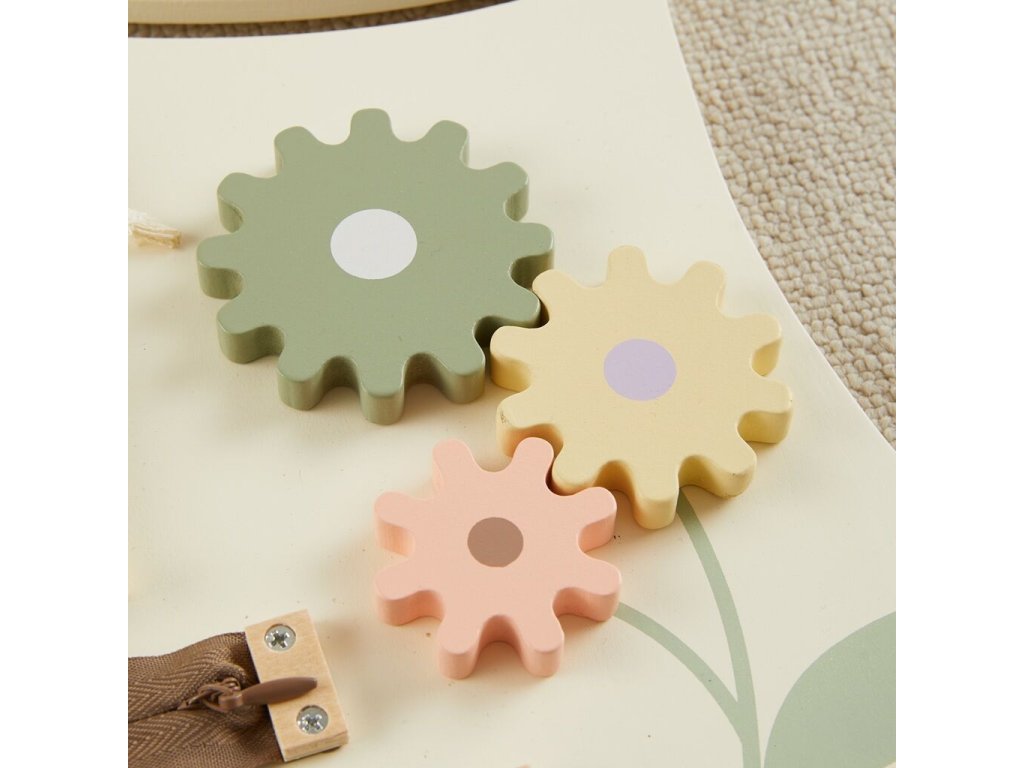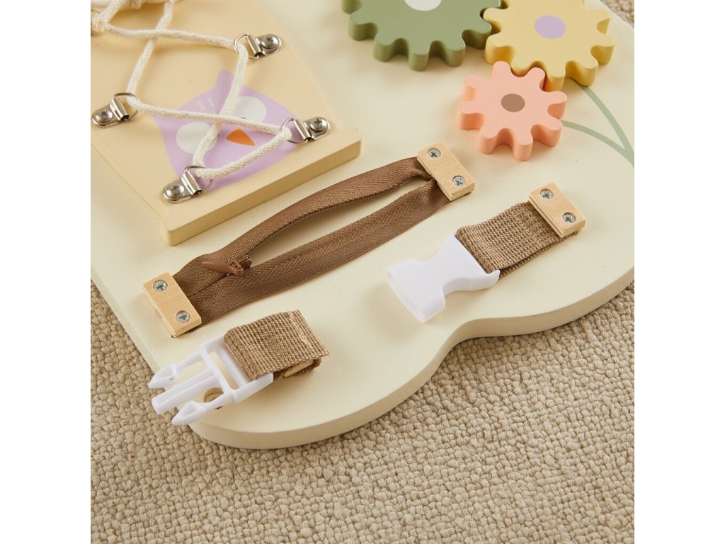 Tato velká dřevěná motorická deska ve tvaru sovy v jemných pastelových barvách zaujme děti už na první pohled. A to nejen svým roztomilým vzhledem, ale hlavně pestrou nabídkou aktivit. Na roztažených křídlech najdou děti více než deset různorodých herních prvků: xylofon, ozubená kolečka, zrcátko, bludiště, posuvné a otevírací prvky, magnetickou tabulku s magnety, dvířka s hmatovým překvapením uvnitř a různě barevné korálky. Všechny tyto detaily děti motivují ke zkoumání, objevování a hravému učení.