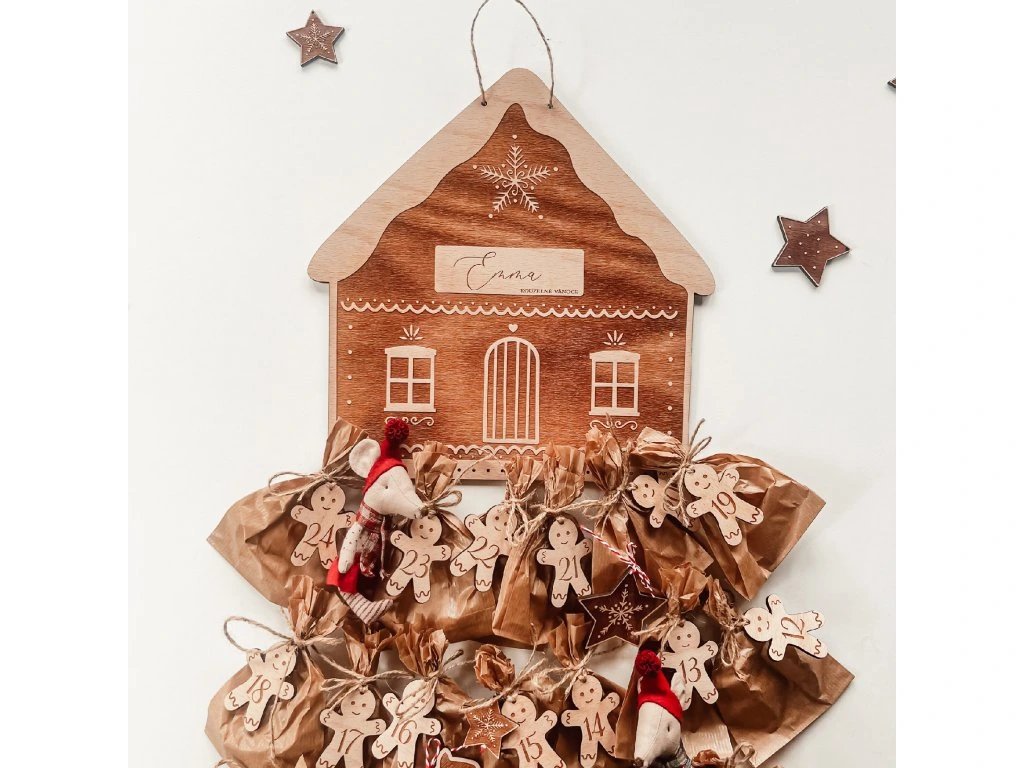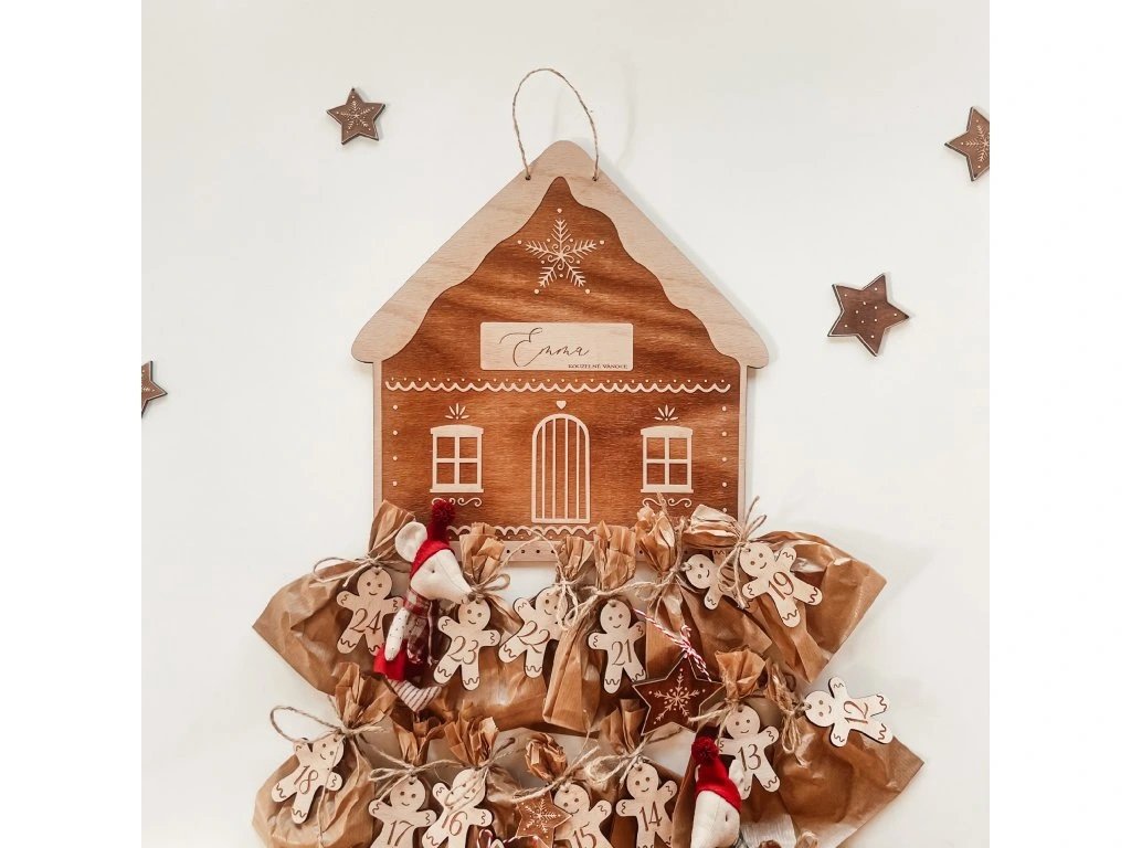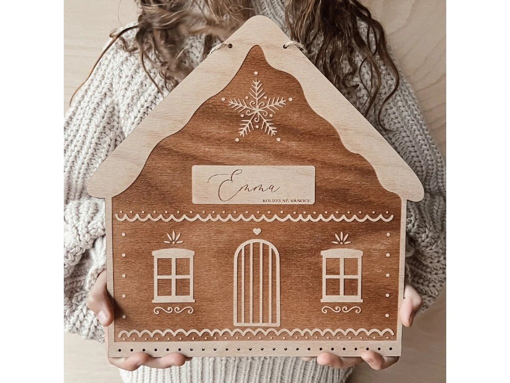 Tento nádherný adventní kalendář ve tvaru perníkové chaloupky se jménem/jmény na přání je vyroben z kvalitního dřeva a přinese vám nezapomenutelný zážitek během celého adventního období.