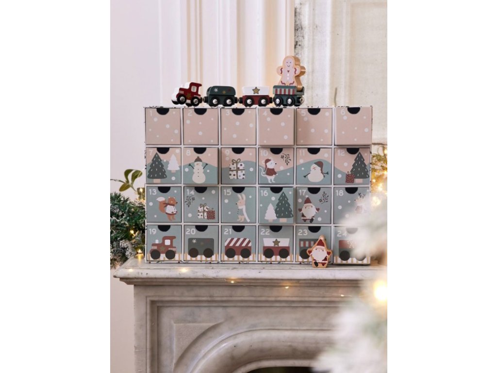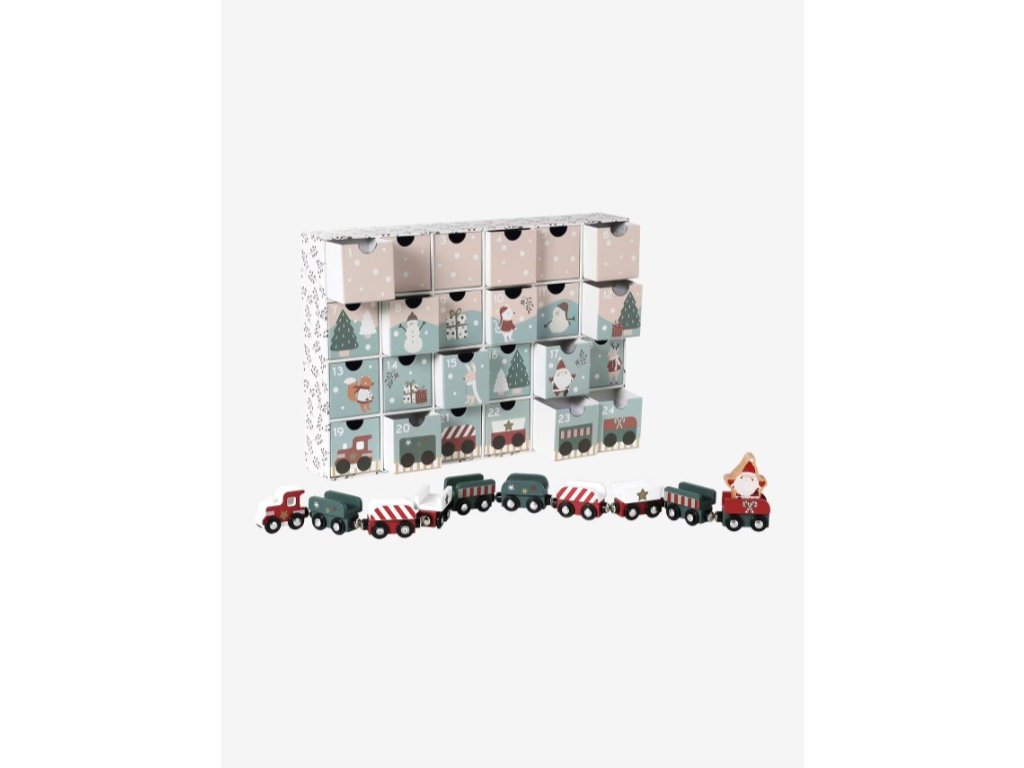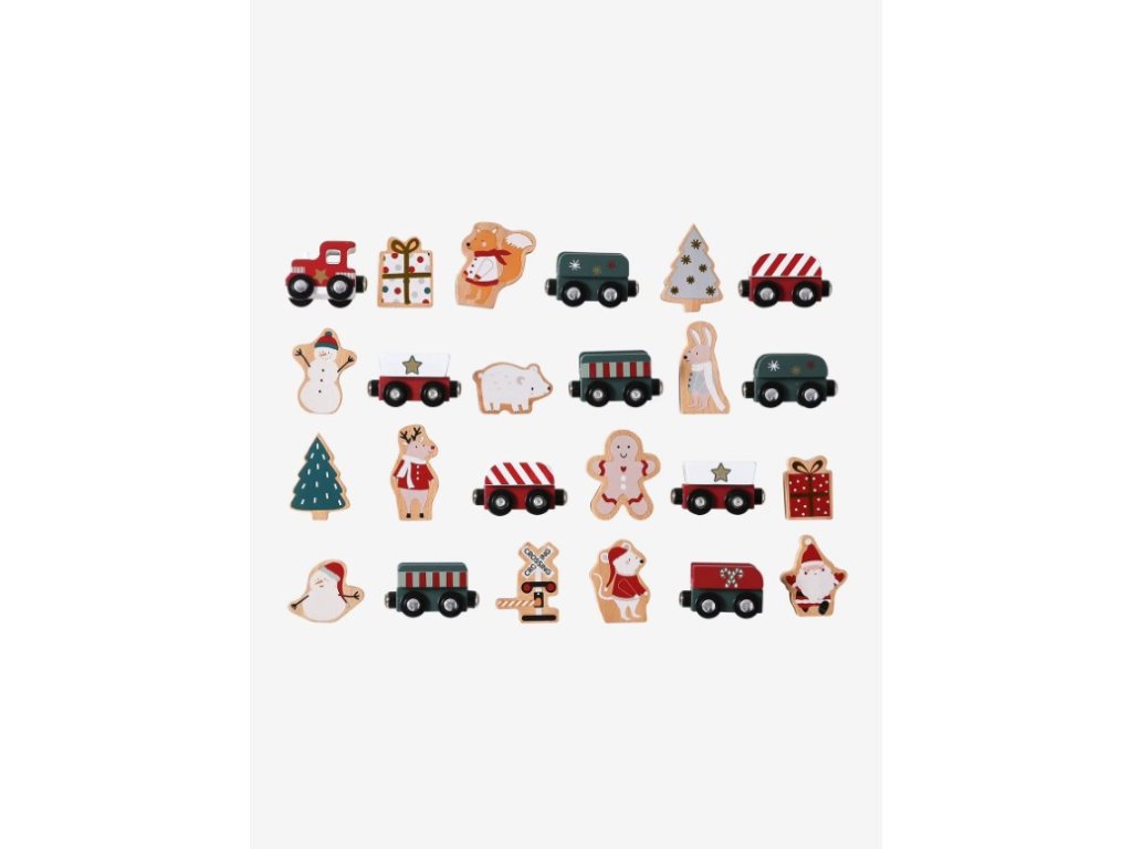 Děti si budou moci vytvořit svůj vlastní malý svět, ve kterém si budou rády vyprávět příběhy! Kartonová krabice s 24 zásuvkami 24 malých dřevěných hraček uvnitř zásuvek (1 v každé zásuvce) Kalendář Vláček obsahuje dřevěnou mašinku s devíti vagónky a další figurky jako je liška, sněhulák, sob a další. Nechybí ani Ježíšek, kterého