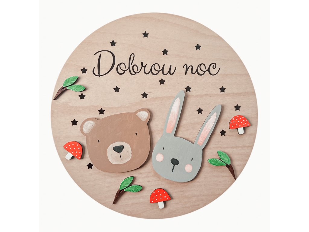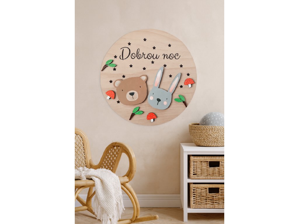 Vyrobeno z 4mm bukové překližky. Podsvíceno led páskem na 3 AA baterie (nejsou součástí). Zvířátka jsou malována voděodolnými barvami.