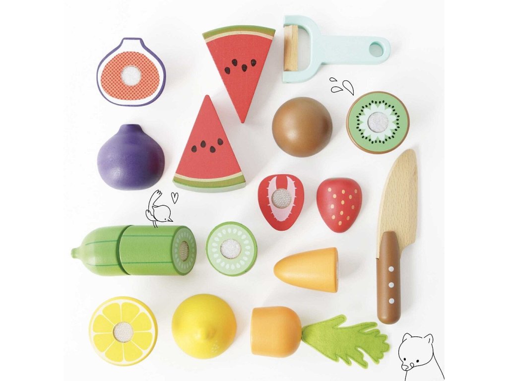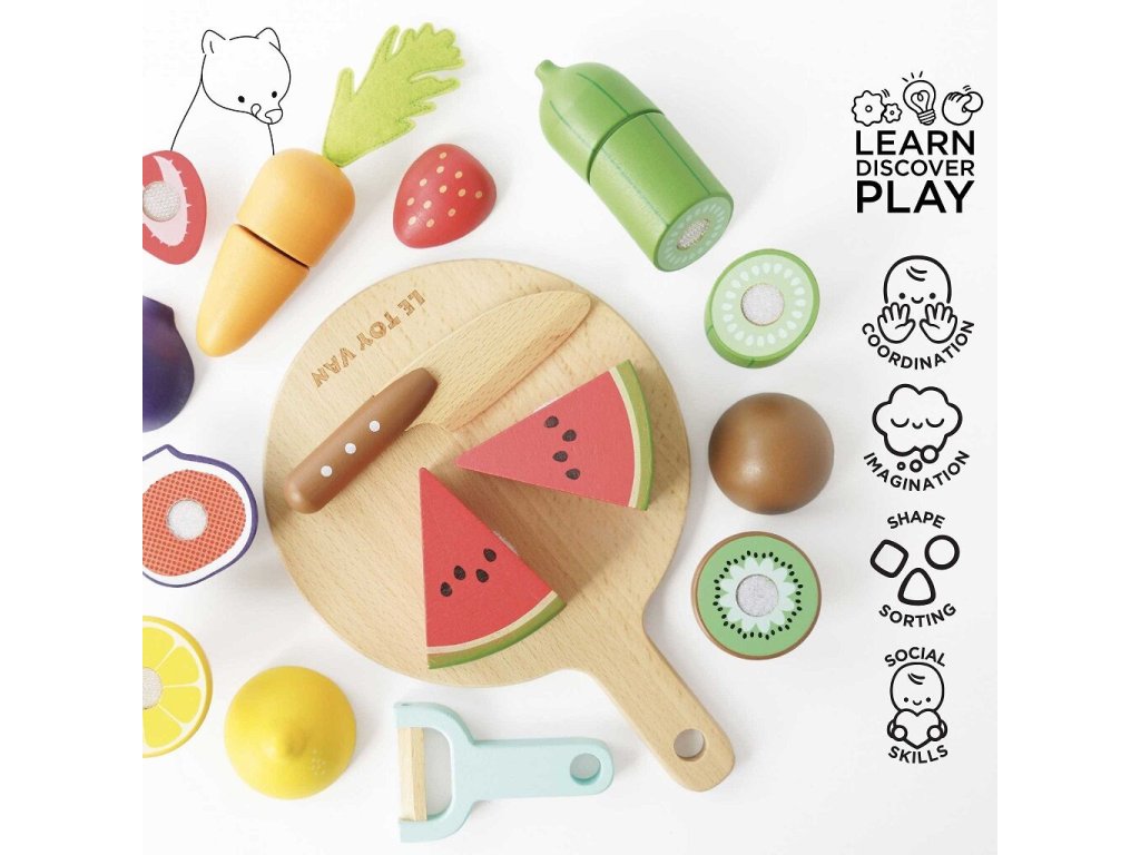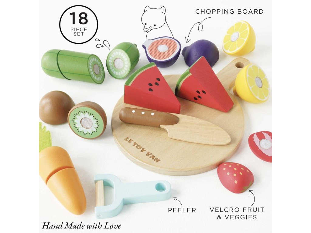 Začínající kuchaři si jistě zamilují přípravu lahodných jídel s touto nádhernou 18dílnou sadou. Nápaditá hračka je skvělým doplňkem při scénářích a hraní rolí. Obsahuje přírodní dřevěné prkénko, škrabku, nůž a výběr chutně vypadajících potravin, jenž mohou být pomocí chytrého suchého zipu snadno „nakrájeny“. Skvělý dárek pro podporu sociálních dovedností, zlepšení obratnosti a zdokonalování jemné motoriky! Sada je vyrobena ze dřeva s certifikací FSC® (dřevo z lesů obhospodařovaných udržitelným způsobem) a zdobena barvami na vodní bázi bezpečnými pro děti.