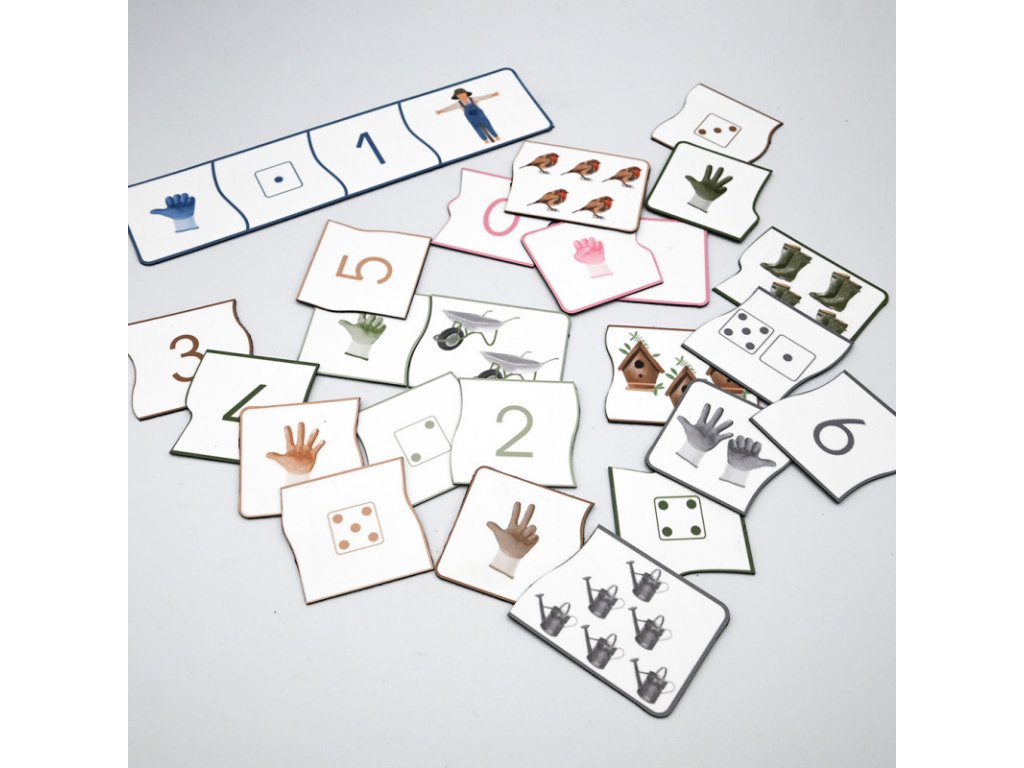 S naším magnetickým puzzle inspirovaným Montessori pedagogikou se děti mohou naučit číslice až do 10 tím, že budou spojovat obrázek, číslo, hrací kostku a ruku.