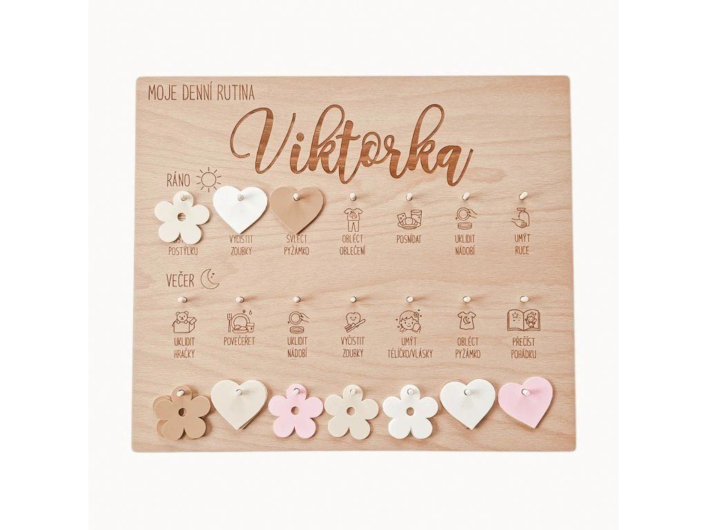 Cedule zobrazuje ranní a večerní rutinu rozdělenou do jednotlivých kroků. Každý úkol (např. vyčistit zoubky, uklidit hračky, obléct se...) je znázorněn pomocí jednoduchého obrázku a textu. Když dítě úkol splní, označí ho barevnou ikonou (hvězdička nebo mráček), kterou jednoduše zavěsí na kolíček pod danou činnost.