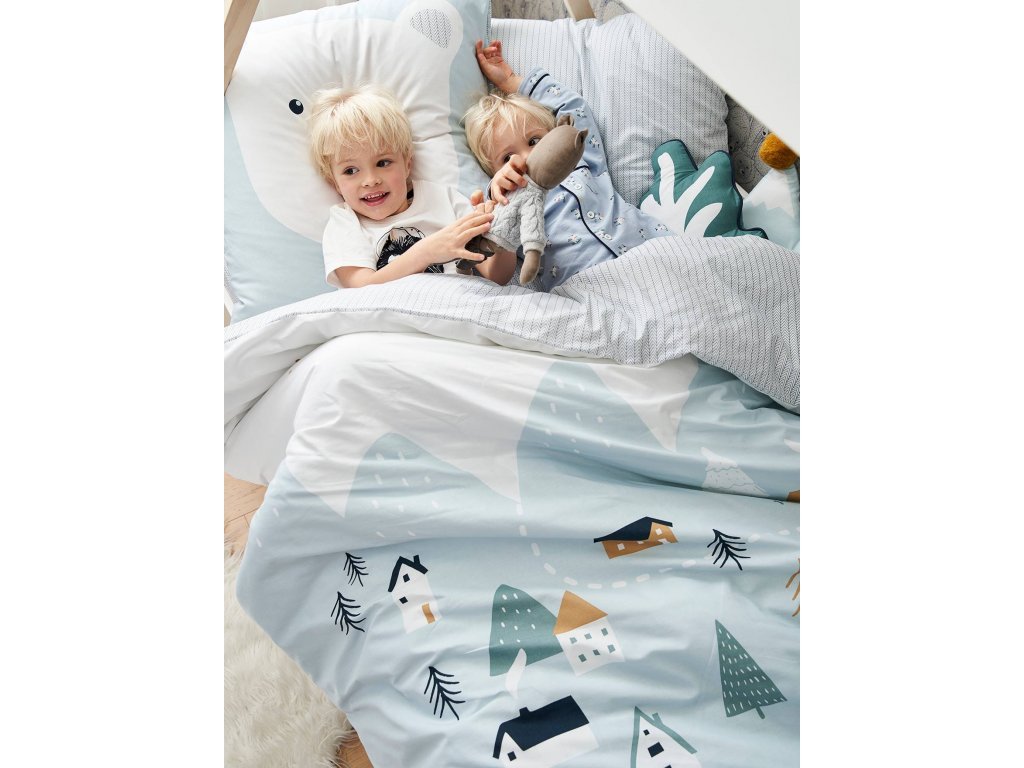 Zasněžená krajina, do které se děti budou rády přitulovat během chladných zimních nocí! Tato sada se skládá z oboustranného povlaku na přikrývku a povlaku na polštář a je pozvánkou k odpočinku a cestování do zasněžených hor...