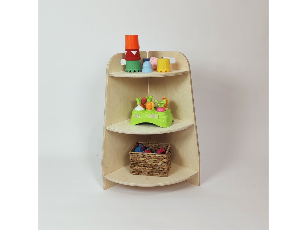 Dětský rohový regál na hračky inspirovaný Montessori metodikou. Stabilní konstrukce navržená tak, aby si děti mohly do regálu dát své oblíbené hračky a jiné poklady.