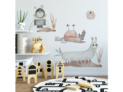 Tištěná samolepka na zeď vyřezaná z matné fólie s motivem vesmírných příšerek potěší každého malého kluka.