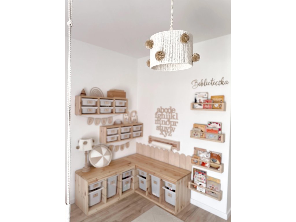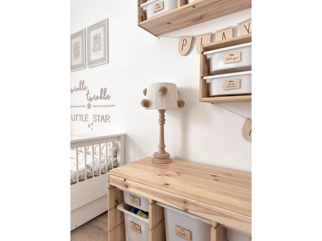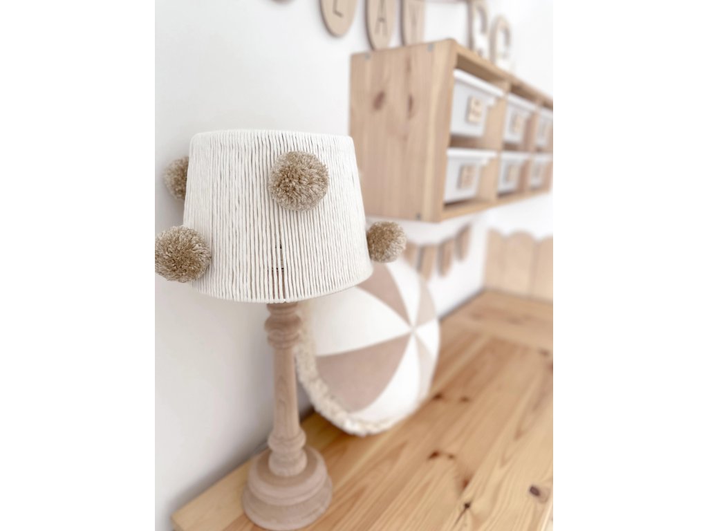 Ručně vyrobená lampička zdobená bambulkami je originálním doplňkem nejen do dětského pokoje. Stínidlo lampičky je vyrobeno z bavlněného provázku. Během dne bude lampička skvělou dekorací pokojíčku a večer poslouží jako jemný zdroj světla.