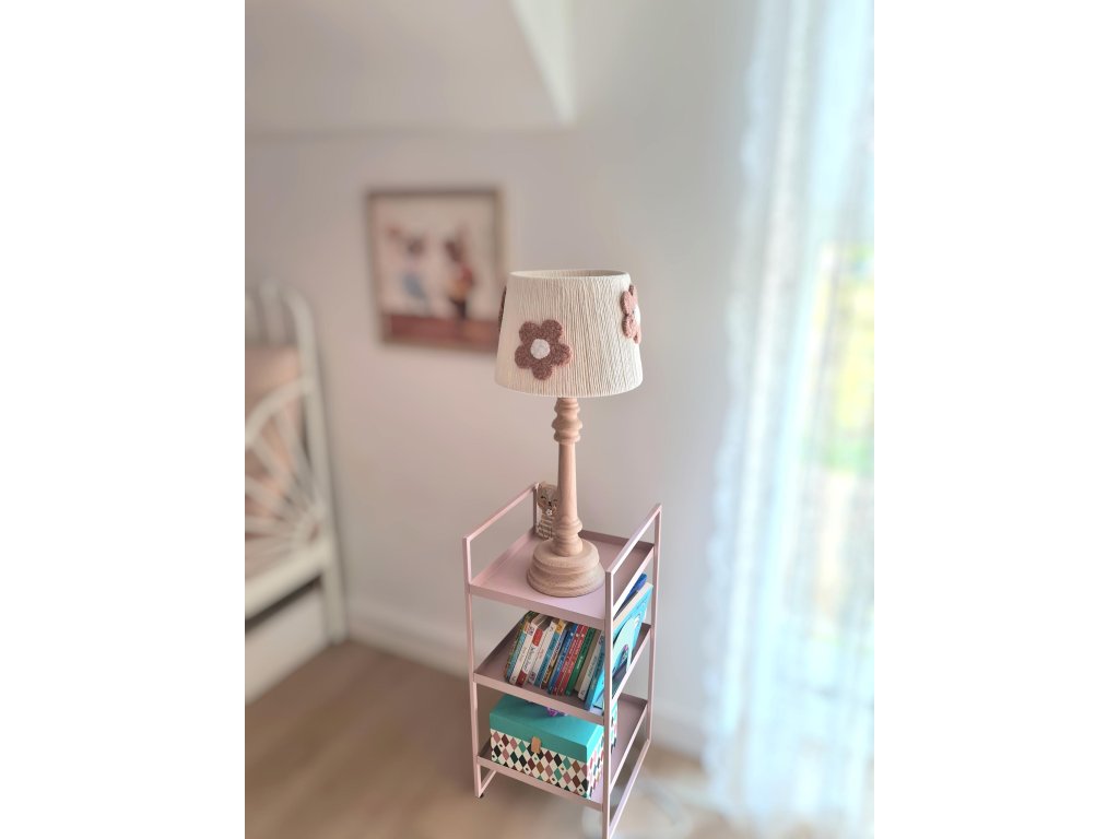 Ručně vyrobená lampička zdobená plyšovými květy bude ozdobou každého dívčího pokoje. Stínidlo lampičky je vyrobeno z bavlněného provázku a plyšových květin. Během dne bude lampička skvělou dekorací pokojíčku a večer poslouží jako jemný zdroj světla.