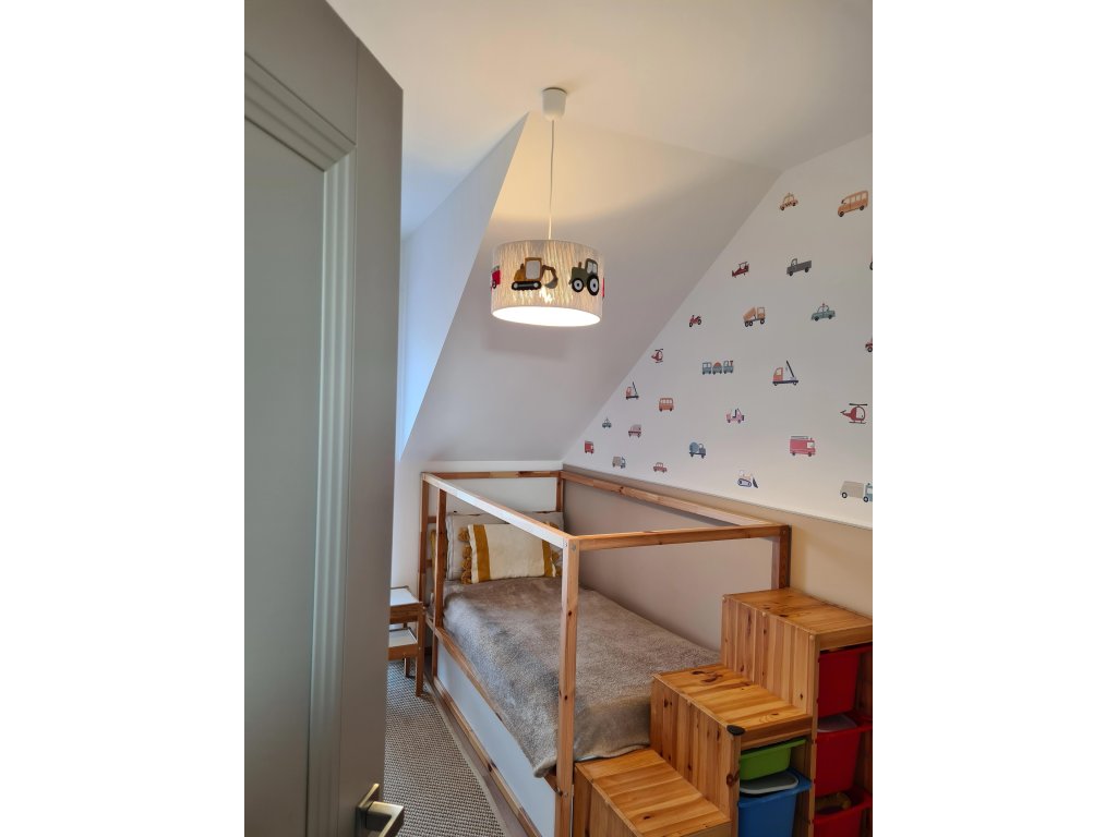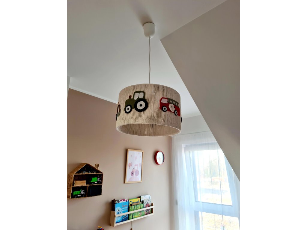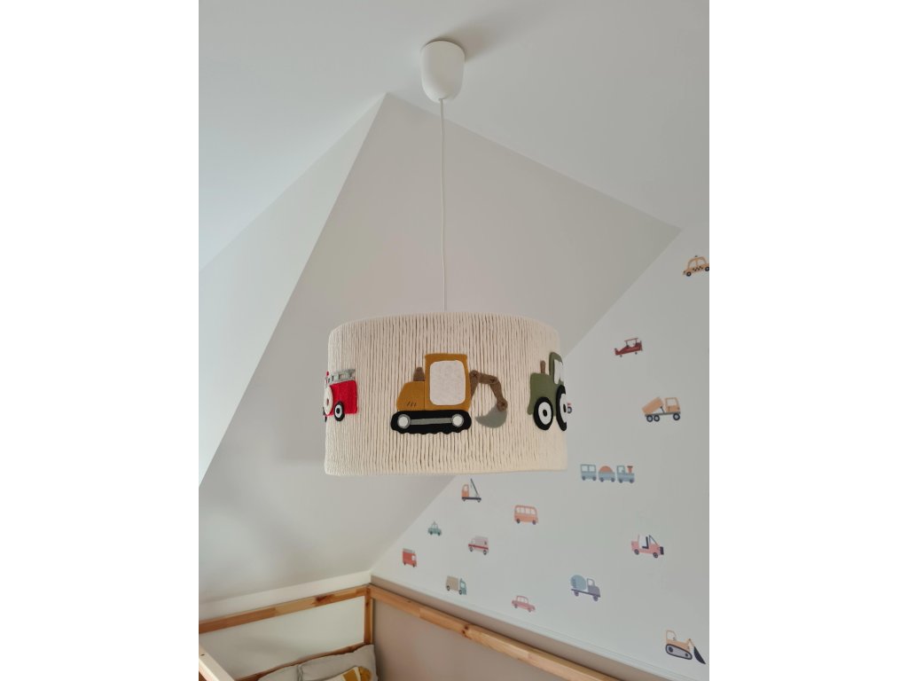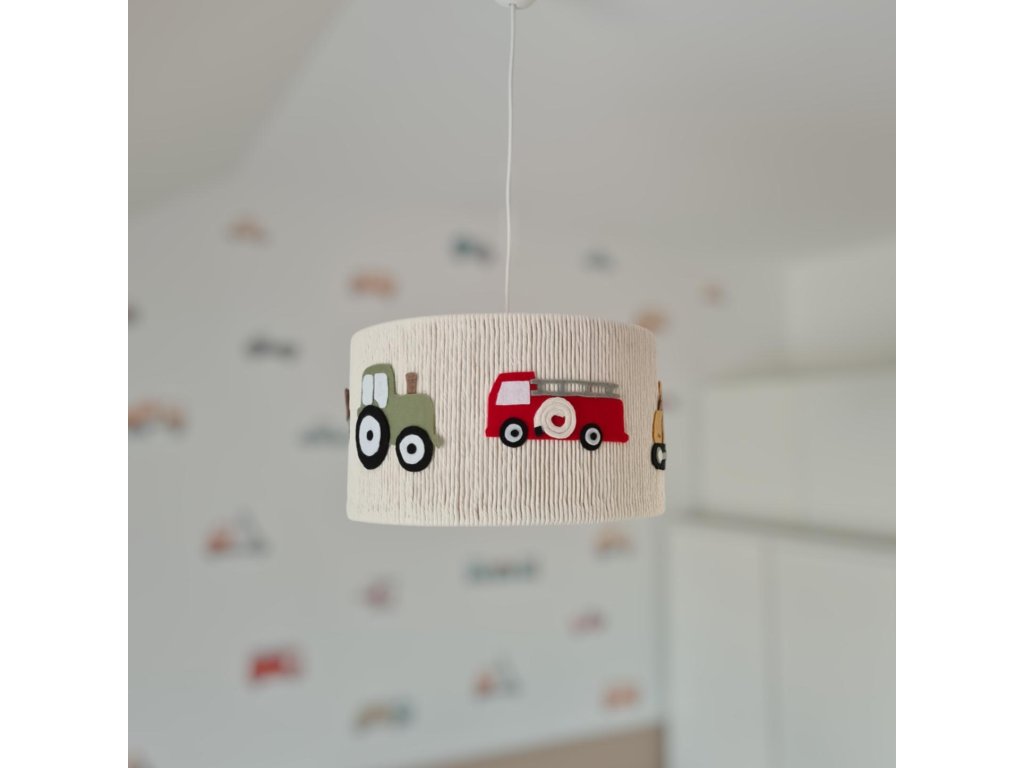 Lustr je zdobený plstěnými autíčky - traktor, hasiči a bagr.