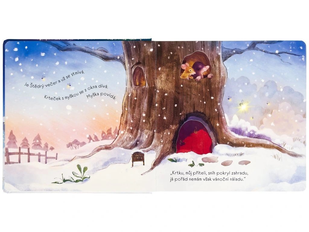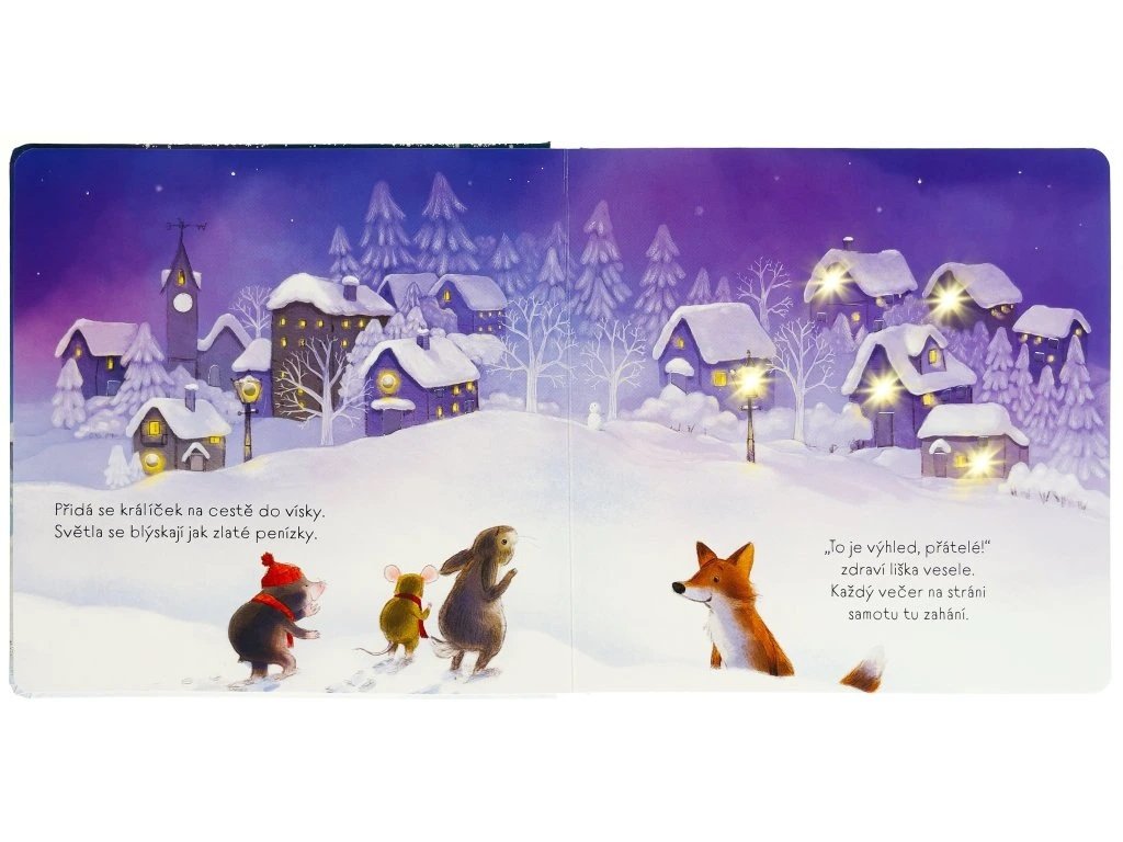 Spočítej světélka, lampy a hvězdičky, a nechej se překvapit stejně jako myška tím, co jí kamarádi z lesa přichystají na Štědrý večer pod oknem. Krásné leporelo se světélky na každé dvoustraně, která děti nejen zabaví, ale také jim pomohou uklidnit se a usnout. Myška s krtkem se vydávají na vánoční procházku, aby si zlepšili náladu. Po cestě potkávají další lesní zvířátka. Společně pozorují různá světélka, ať už jsou to hvězdy na nebi, ozdobný řetěz nebo lampy ve vesnici. Když se konečně vrátí z procházky domů, objeví před norou veliké vánoční překvapení. A co to je? To zjistíte na konci knihy i vy, když si prohlédnete všechny krásné ilustrace a spočítáte třpytivá světélka na stránkách tohoto leporela. Až se budou blížit Vánoce, předčítejte si s dětmi před spaním tento milý příběh o zvířatech a společně počítejte světélka. Vytvořte si tak uspávací rituál, který vašim dětem pomůže usnout a také si ukrátit čas při čekání na Ježíška.